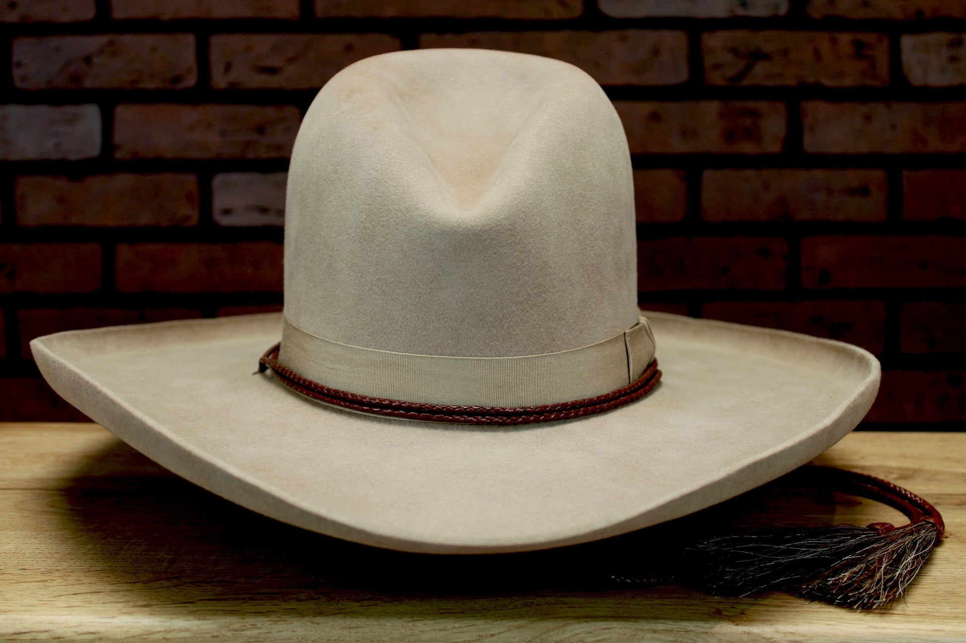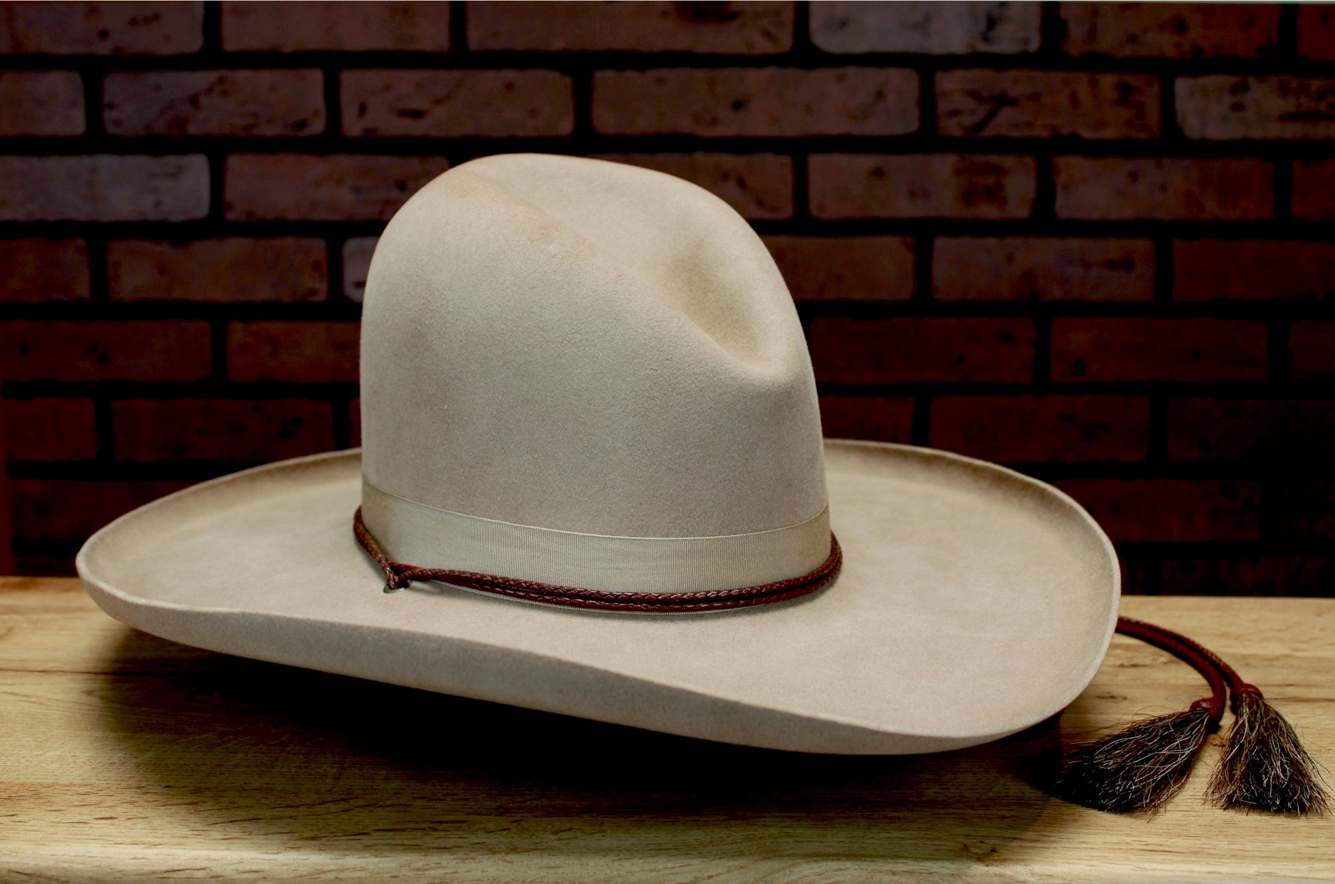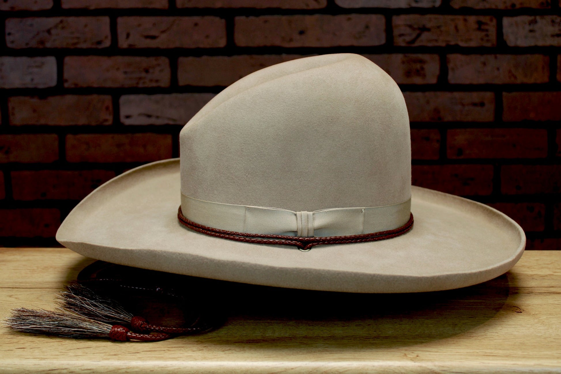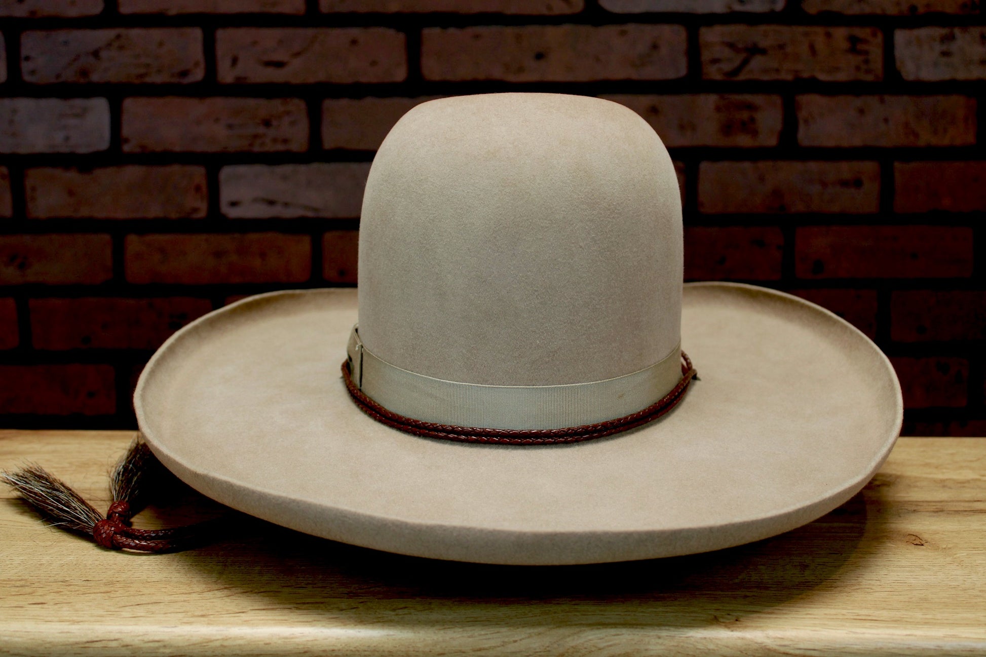 Harken back to the deep old west in this classic sloping crown which transitions from 5 3/4 in the rear to 3 1/2 in the front. A 4 1/2 inch brim loosely curved with an open, pencil rolled rim reminiscent of a by gone era.