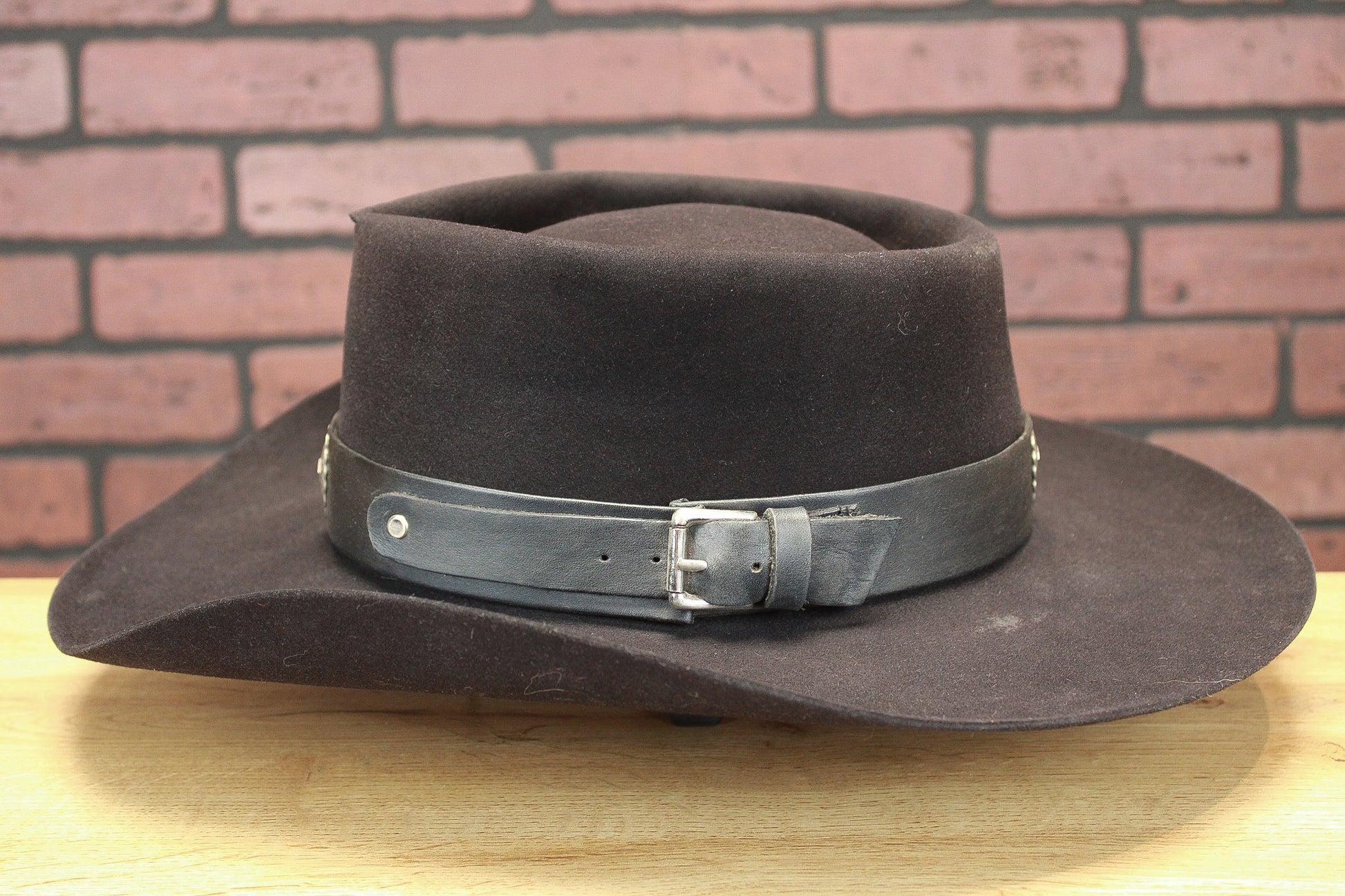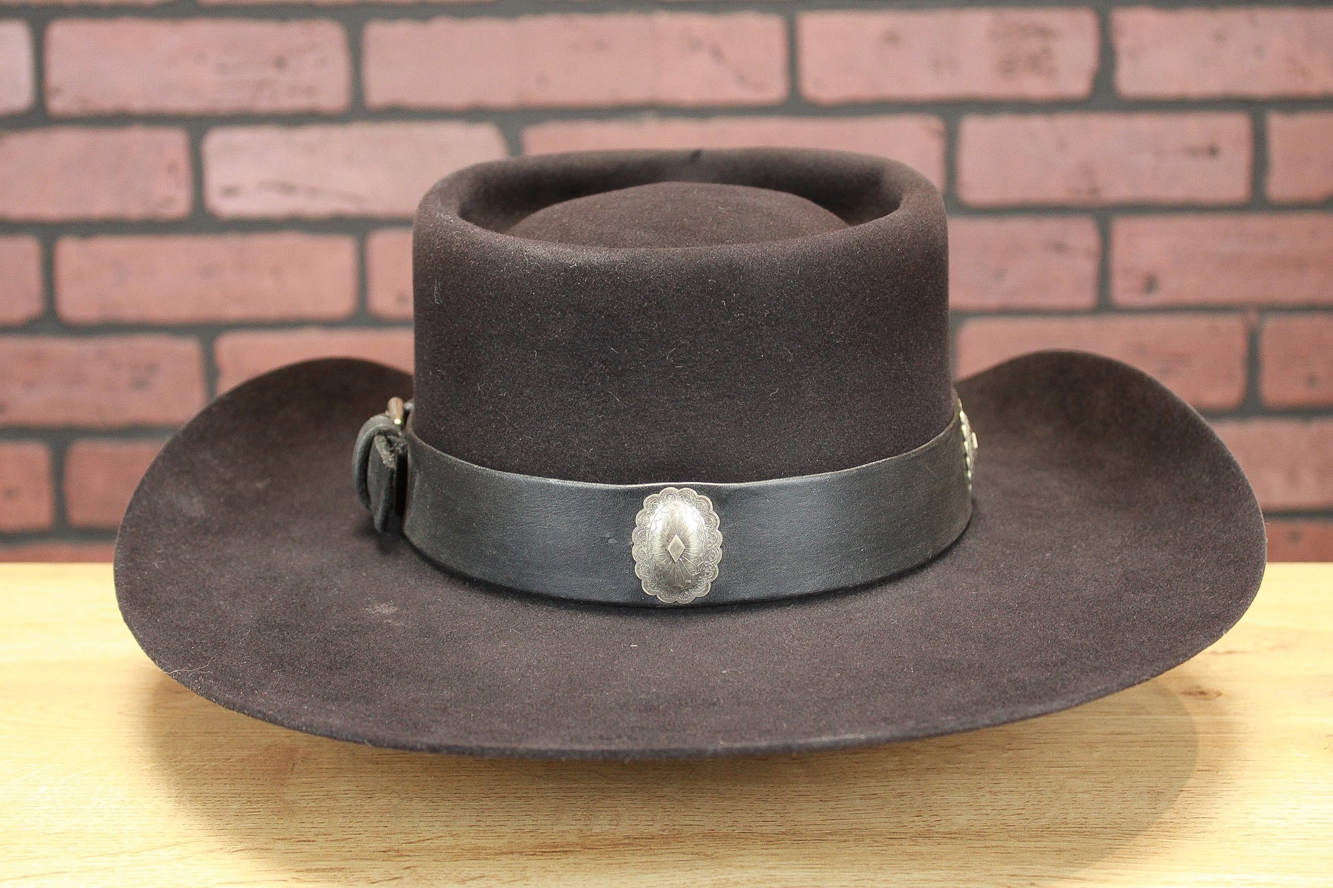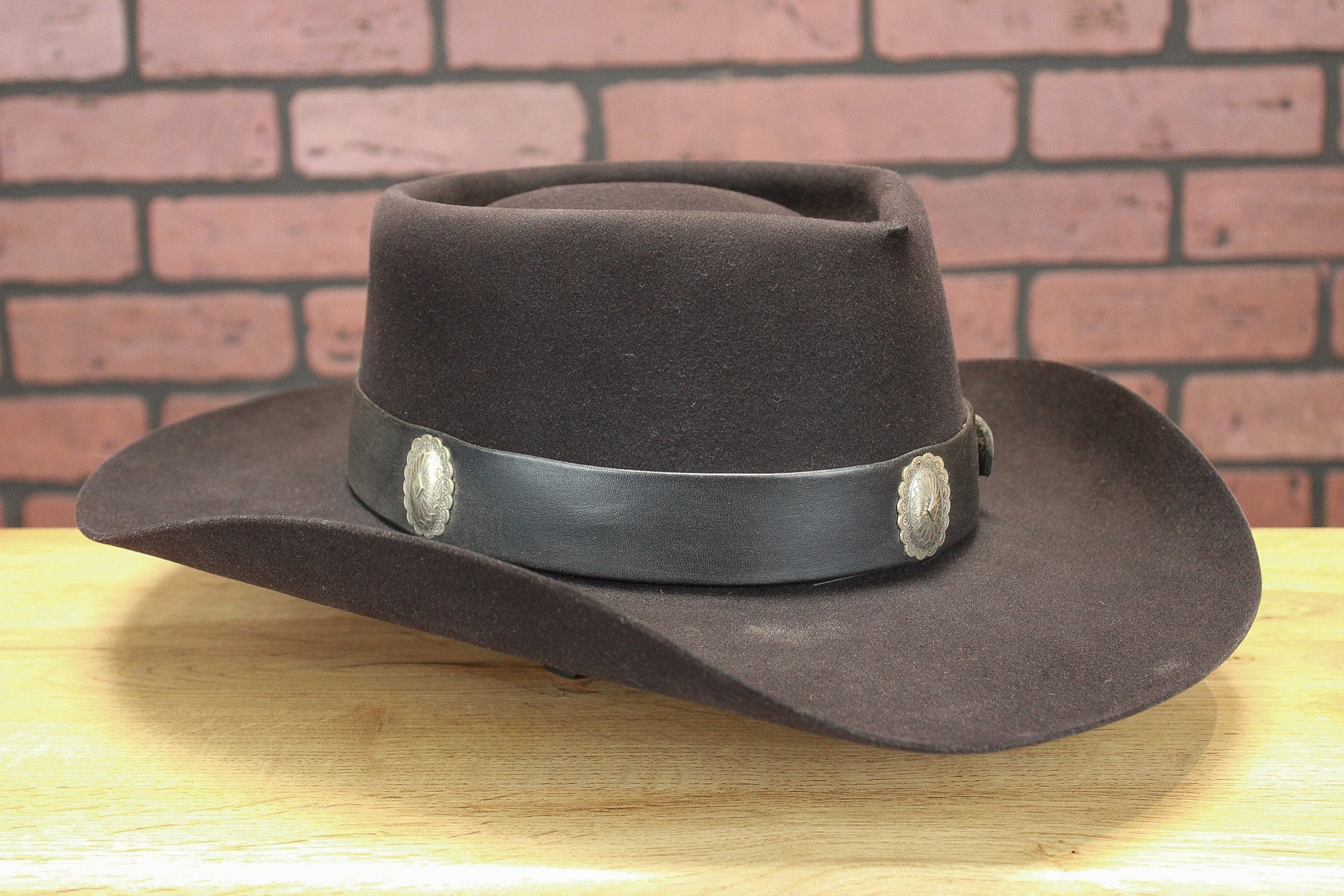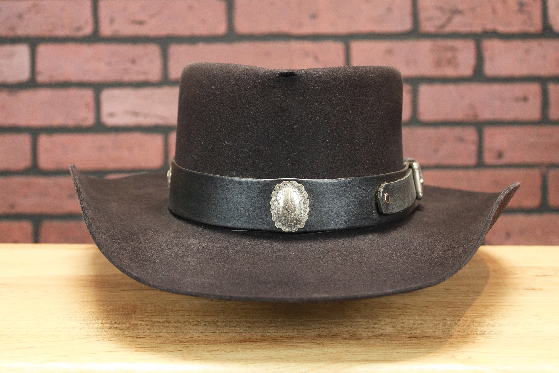 | Hatband | 1 ¼ " wide black leather hatband closed by a riveted black strap and buckle on left side + 3 Special Conchos attached on front, right and back of hatband |