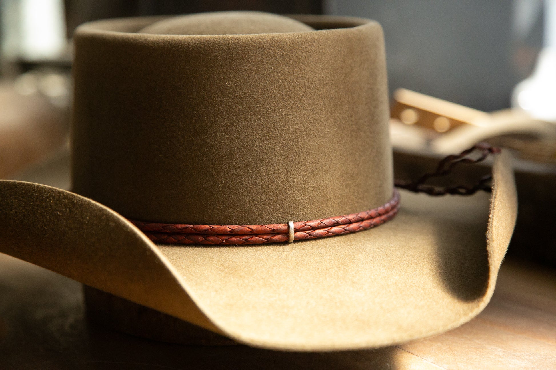 Hatband: Aged double row brown braided leather cord attached by 4 metallic bindings