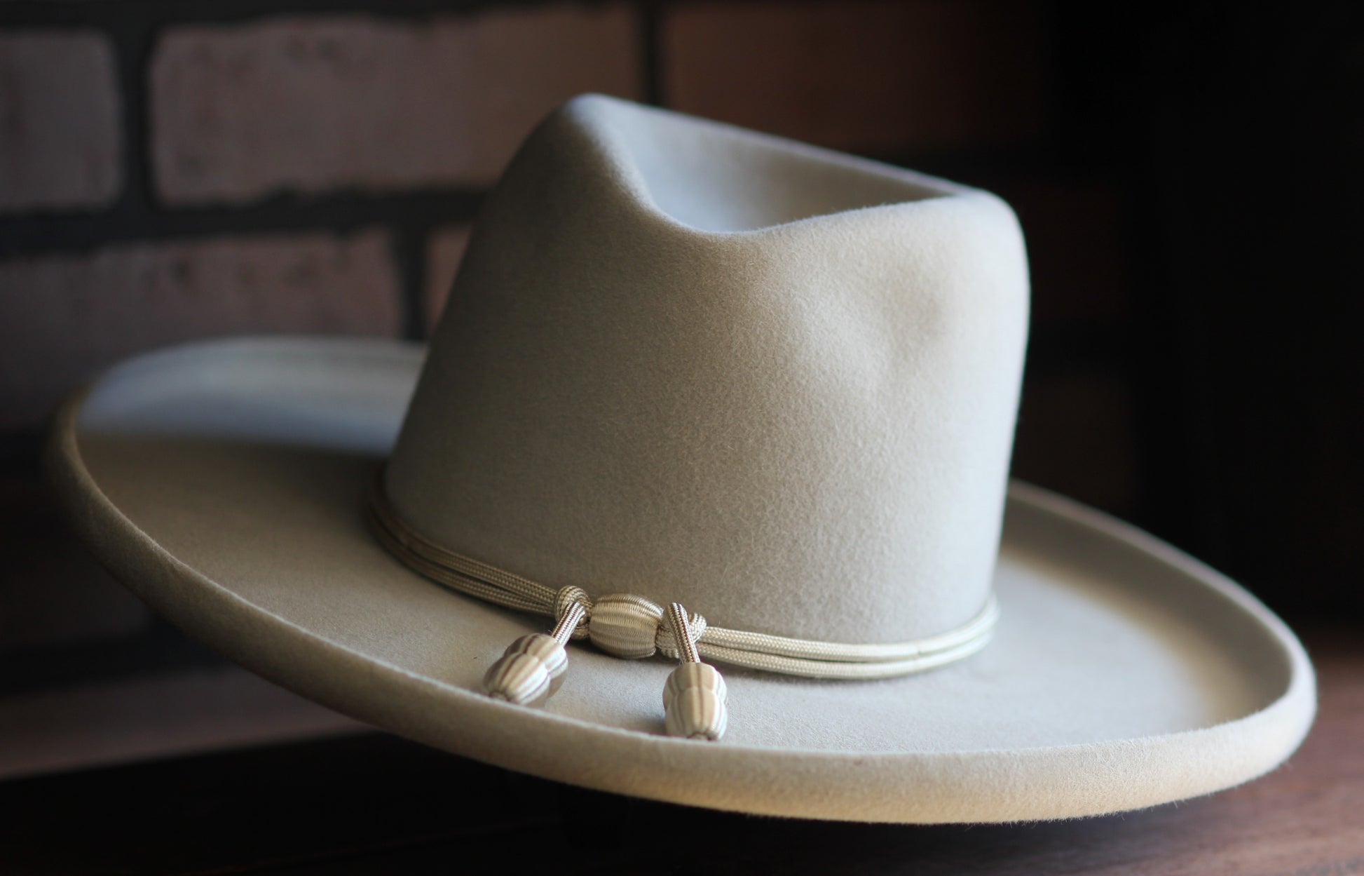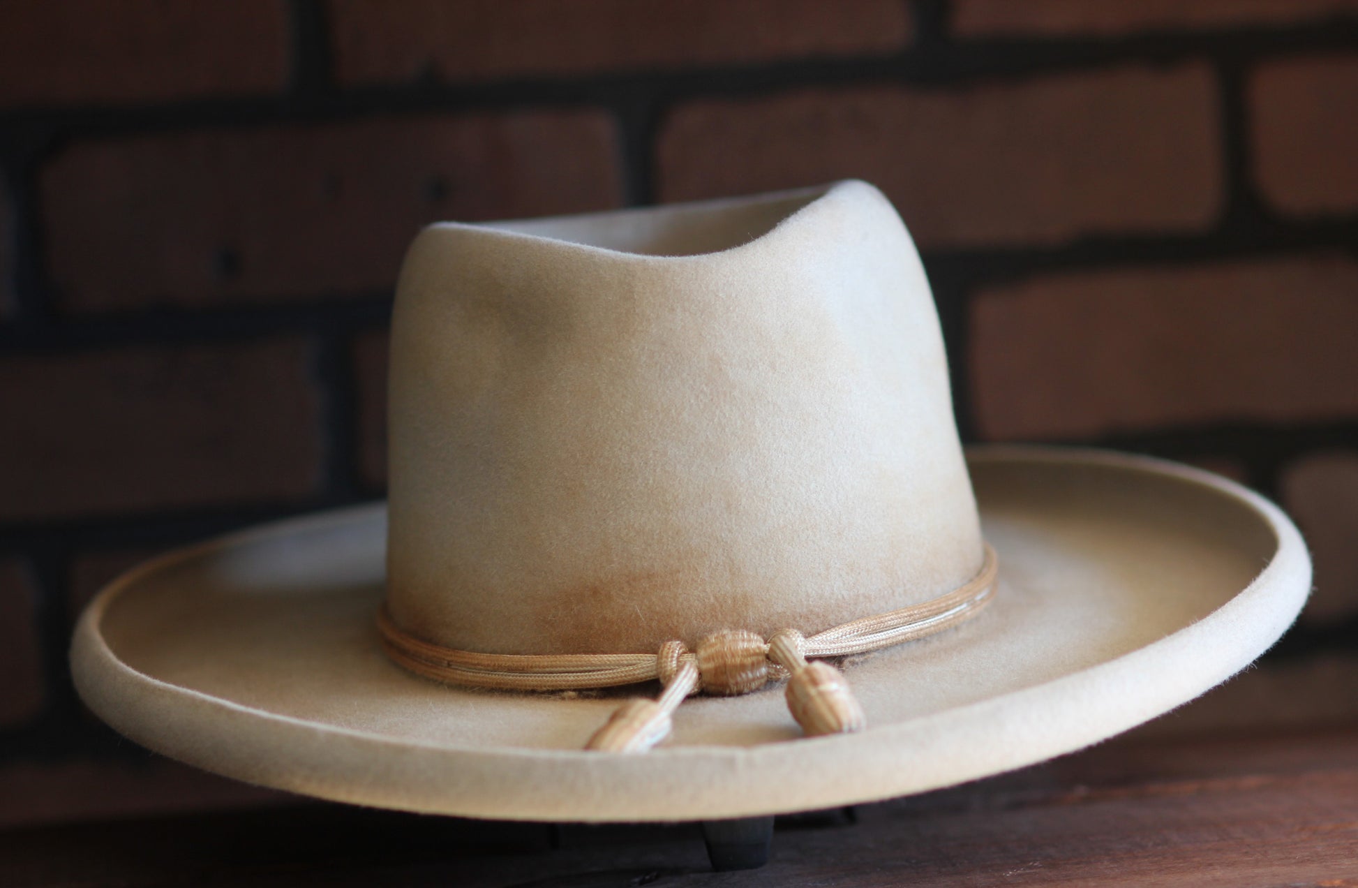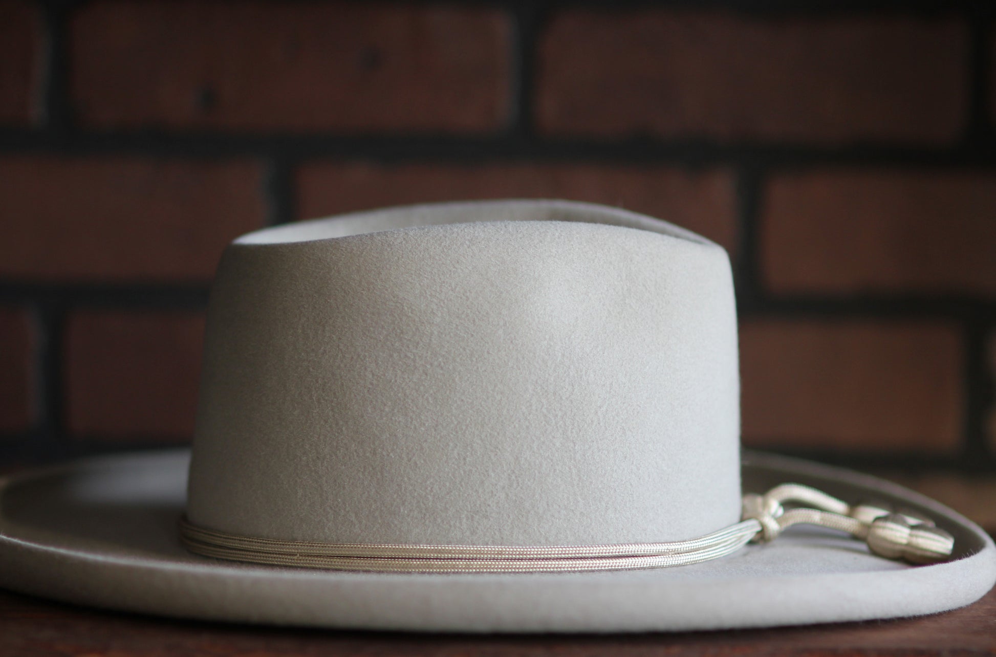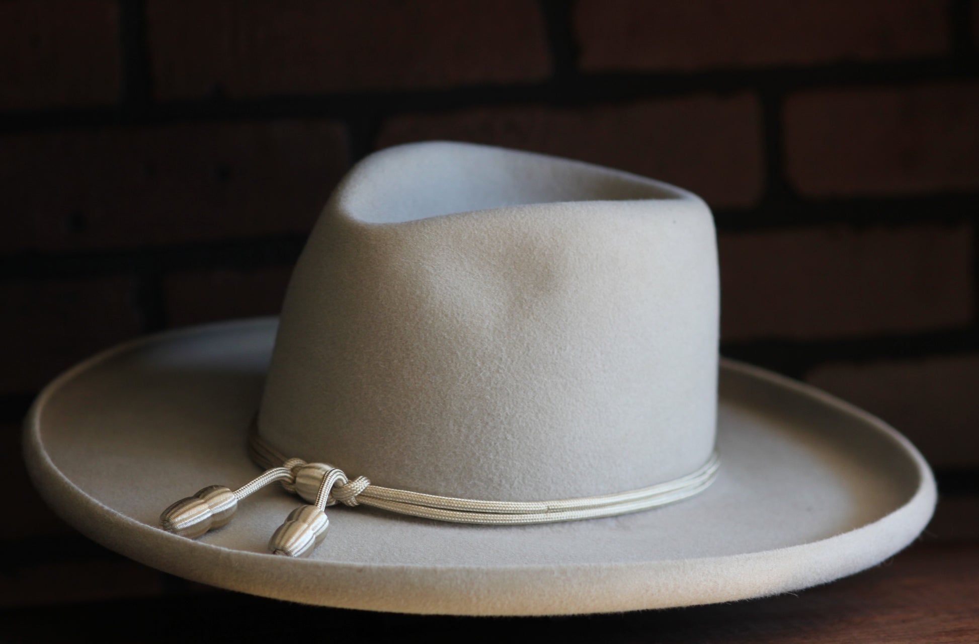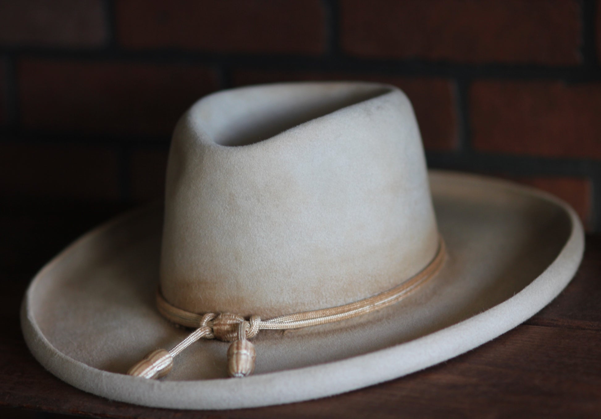 Our "Josey" is inspired by this iconic hat. We make it in either 100% Western Weight Fur Felt, or the original production 200XXX 100% Beaver. Our aging does not effect the integrity of the fur and is the same process we use on all our movie hats.